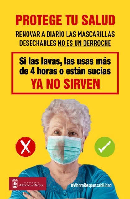 El Consistorio alhameño pone en marcha una nueva iniciativa, dentro de la campaña 'El Ayuntamiento de Alhama te cuida', ante la situación derivada de la Covid-19. En esta ocasión pone el foco en una de las situaciones de riesgo detectadas, como es el uso inadecuado de mascarillas quirúrgicas desechables.