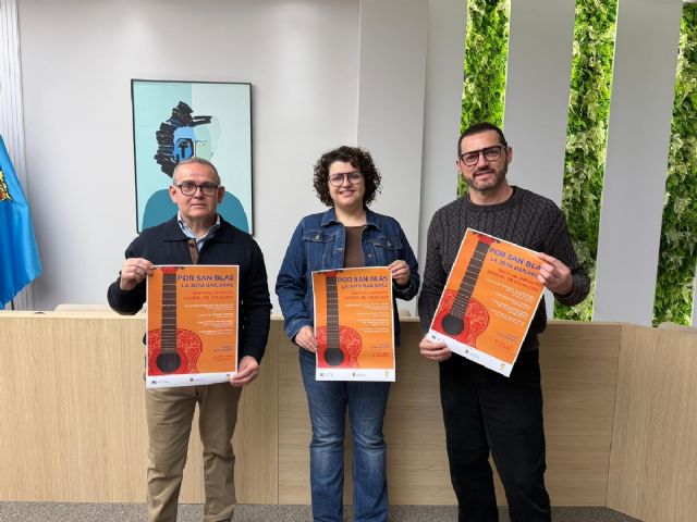 La concejala de Cultura, Alicia Martínez, junto a los miembros de la directiva del Grupo Folklórico Villa de Alhama, José Aledo y su presidente, Blas Pérez, ha presentado el cartel del Festival Infantil y Juvenil de Folklore “Por San Blas, la jota bailarás”, que tendrá lugar el 15 de febrero de 2026, a las 18:00 horas, en el Teatro Cine Velasco.